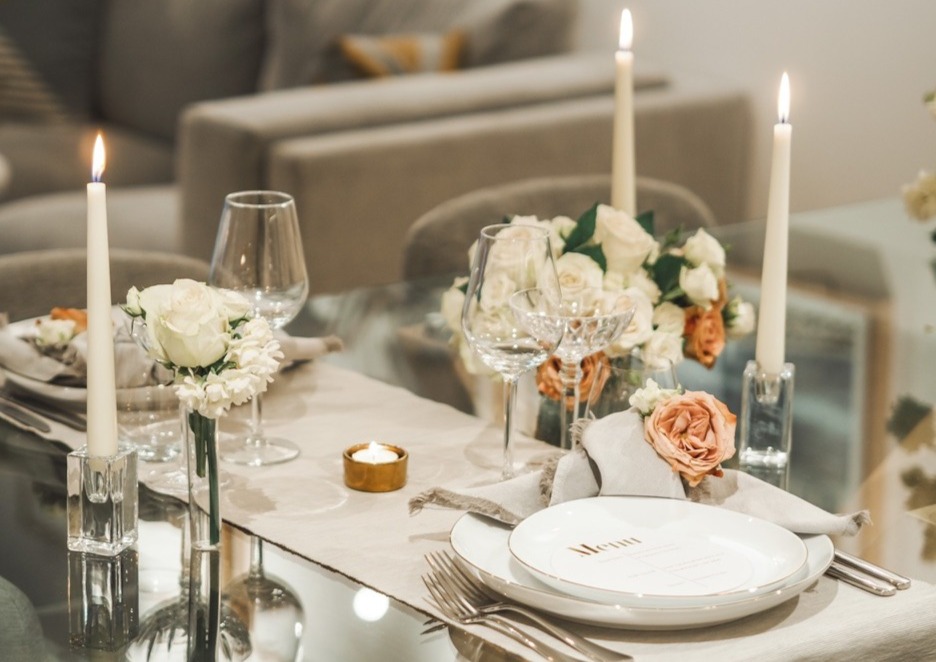 A date dinner table cannot miss candles to create a romantic atmosphere and flowers to set the romance.