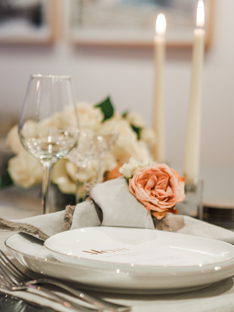 Anne from Flowers by Bear created this beautiful arrangement for us. I loved the use of neutral tones to complement the other elements on our dining table.